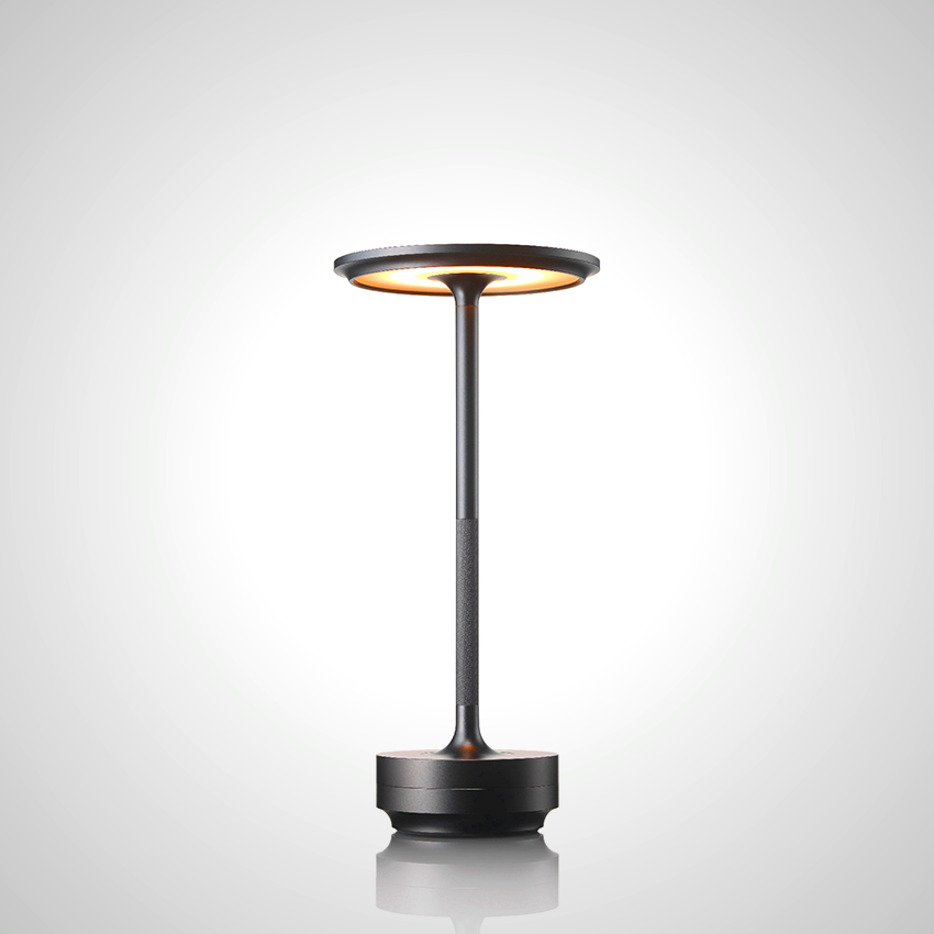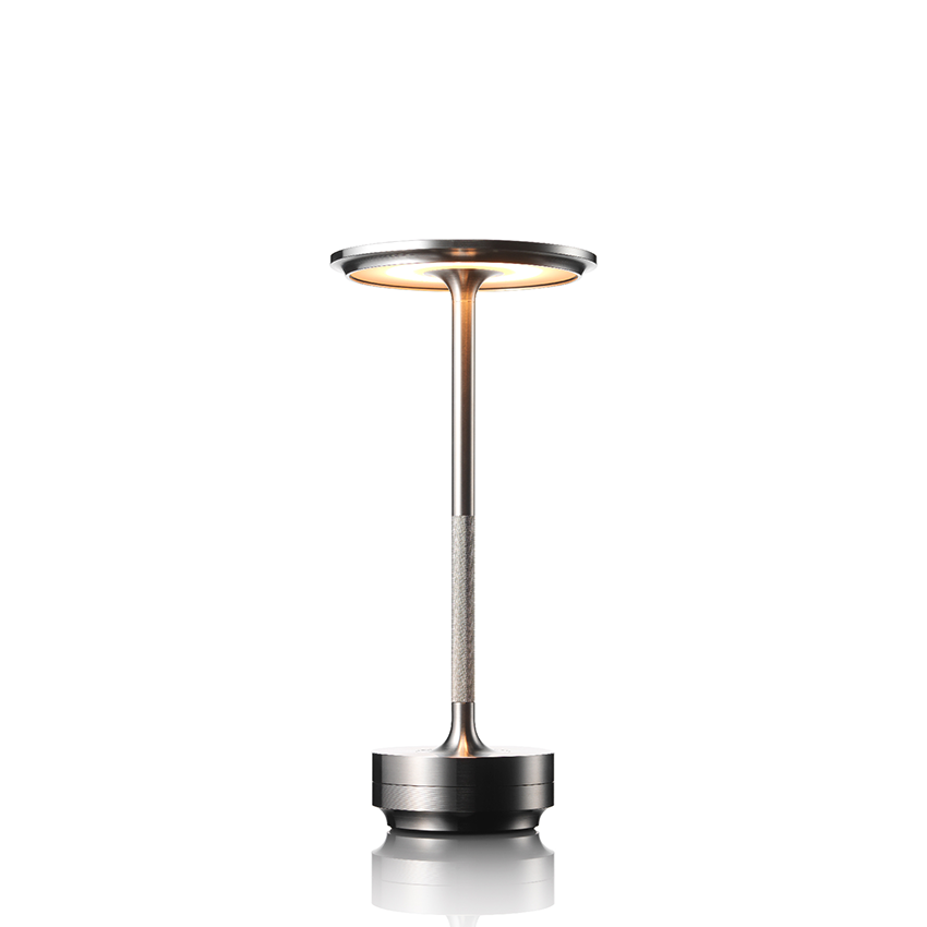 Carved from a spinning block of metal, this cordless table lamp is pure in form and reassuringly firm in texture. It stands tall and sharp, emitting gentle light from beneath its top to fill the dark with a warm radiance that enhances the night.